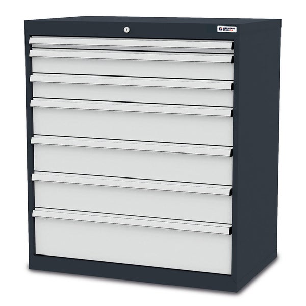 Hinweis: Diesen Artikel erhalten Sie als Speditionslieferung direkt vom Hersteller. Bitte geben Sie uns unbedingt eine Telefonnummer für die Spedition an. Des Weiteren kann dieser Artikel NUR innerhalb Deutschlands versendet werden. (This item can ONLY be shipped within Germany) Schubladenschrank inklusiv 7 Schubladen Artikelbeschreibung: Schubladen: 1x50, 2x100, 3x150, 1x200 verzinkte Schubladen mit glatten Seitenwänden Kugelführung Auszug 100 % Schubladentragkraft 30 kg bei BLH 50 mm Schubladentragkraft 80 kg ab BLH 75 mm BxTxH 900x575x1020 mm + CL9ESOR01