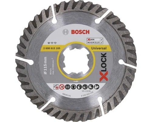 Die X-LOCK Diamanttrennscheibe Standard for Universal ermöglicht zuverlässiges Schneiden in allgemeines Baumaterial. Ihre optimierte Diamantmatrix ermöglicht mit ihrem hohen Qualitätsstandard zuverlässige Ergebnisse. Das Bosch Kompetenzzentrum Diamant in der Schweiz gewährleistet diesen Standard durch kontinuierliches Bereitstellen beständiger Qualität. Geeignet zum Schneiden von Beton und Mauerwerk. Dank schlüssellosem X-LOCK System lassen sich die Trennscheiben schnell und bequem wechseln. X-LOCK Trennscheiben passen auch auf Standard-Winkelschleifer.