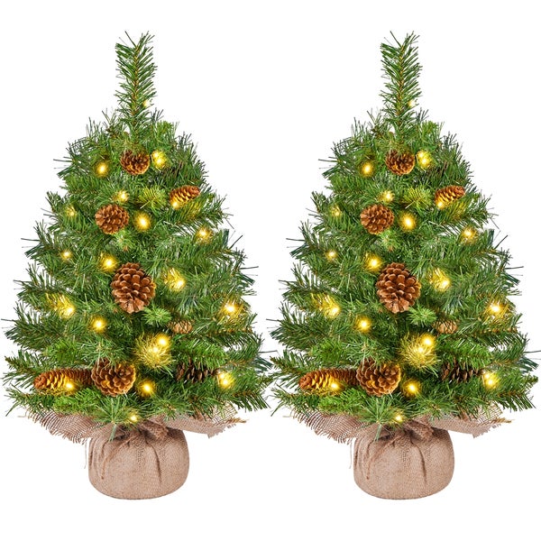 Yaheetech 2er-Set Mini Künstlicher Weihnachtsbaum, 61 cm Tisch-Tannenbaum mit 35 Warmweiß LED Beleuchtung & 12 Tannenzapfen Kleiner Christbaum, Grün
