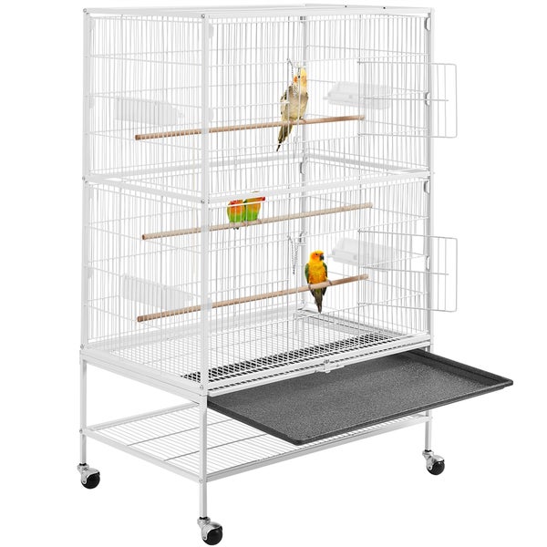 Yaheetech Große Vogelvoliere, 132 cm hoch, mit 2 Türen, Vogelhaus, Holzsitzstangen und 4 Rollen mit Schmutzauffangwanne, Weiß