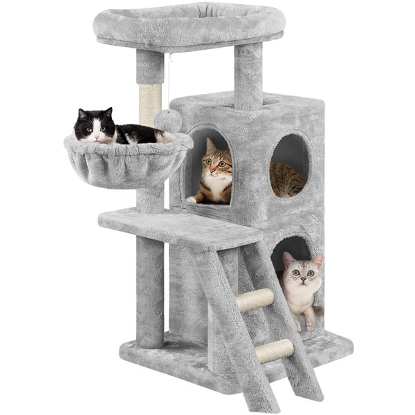 Yaheetech Katzenbaum, 94 cm hoch, Kletterbaum für Katzen mit Aussichtsplattform, zweistöckiger Katzenhöhle, Hängematte, Treppe und hängendem Plüschball, Hellgrau