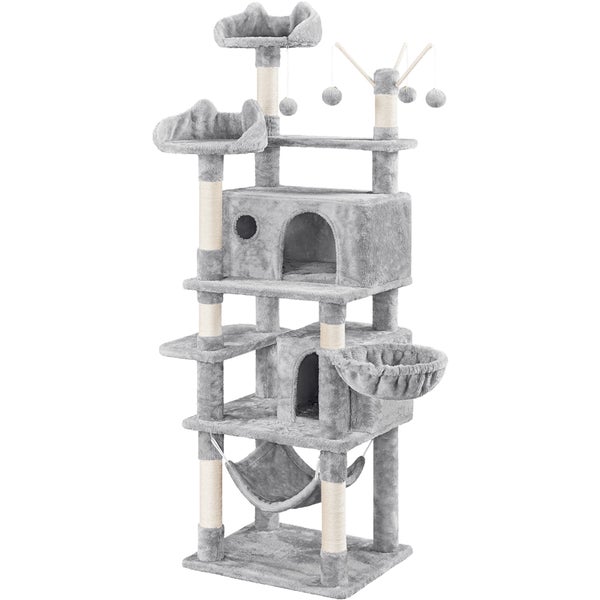 Yaheetech Kratzbaum, 170 cm XL Stabiler Katzenkratzbaum mit 2 Aussichtsplattformen in Katzenohrform & 2 Katzenhöhlen & Hängematte & Liegemulde & 4 Plüschbälle für Katzen, Hellgrau
