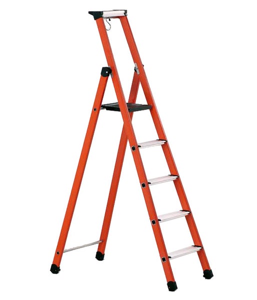 Die Sicherheitsleiter für Spezialeinsätze in der chemischen und pharmazeutischen Industrie, Elektrizitäts-, Gas- und Wasserwerken 80 mm tiefe Leichtmetall-Stufen mit rutschfester Riffelung Für Arbeiten an Elektroanlagen durch isolierende Holme aus glasfaserverstärktem Kunststoff Sicherheitsplattform (250 mm x 250 mm) Sicheres Ablegen von Zubehör und Werkzeug in Kunststoff-Ablageschale Zusammengeklappt nur 88 mm tief Stufen aus Alu-Strangpressprofil