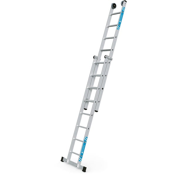 Sicherer ganz oben stehen. Die Schiebeleiter mit Stufen statt Sprossen. Wandschonendes Verstellen durch Kunststofflaufrollen an der Oberleiter. Höhenverstellbar im Raster von 280mm. Material: Aluminium Beschichtung: natur Sprossen-/Stufen-Holm-Verbindung: gebördelt Sprossen-/Stufentiefe: 30mm/80mm Sprossen-/Stufenabstand senkrecht: 265mm Sprossen-/Stufenart: geriffelt/SaferStep Laufrollen: Gummi Äußere Breite: 420 mm Belastung: 150,0 kg Norm: EN 131 professional