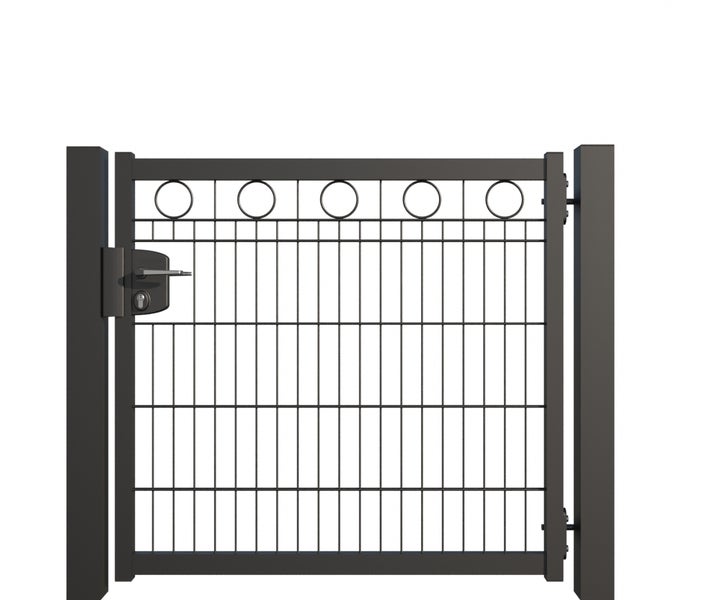 Zauntür ZAUNGURU BASIC-Linie Berlin Kreis aus Metall, Höhe: 103cm, Breite: 123cm, 1-flügelig inkl. Pfosten, Schloss und Zubehör, Feuerverzinkt und zusätzlich in RAL 7016 Anthrazitgrau pulverbeschichtet