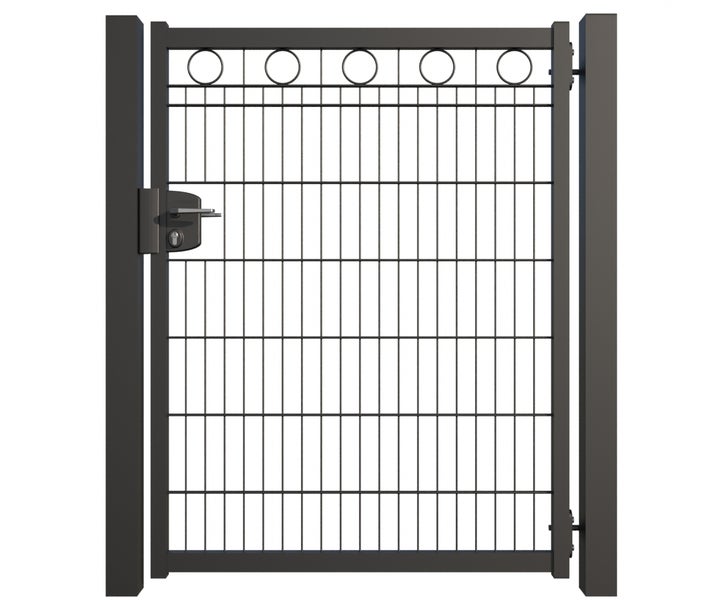 Zauntür ZAUNGURU BASIC-Linie Berlin Kreis aus Metall, Höhe: 143cm, Breite: 123cm, 1-flügelig inkl. Pfosten, Schloss und Zubehör, Feuerverzinkt und zusätzlich in RAL 7016 Anthrazitgrau pulverbeschichtet