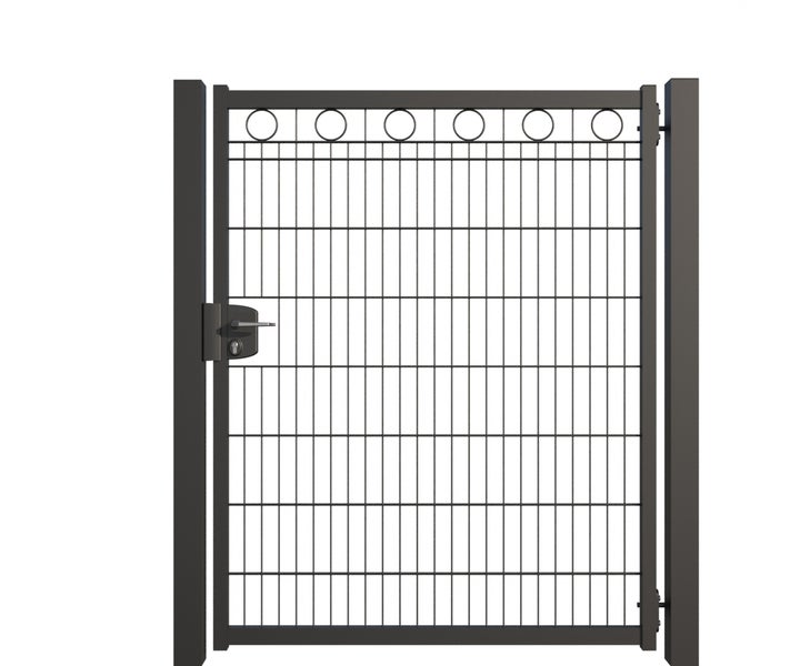Zauntür ZAUNGURU BASIC-Linie Berlin Kreis aus Metall, Höhe: 163cm, Breite: 150cm, 1-flügelig inkl. Pfosten, Schloss und Zubehör, Feuerverzinkt und zusätzlich in RAL 7016 Anthrazitgrau pulverbeschichtet