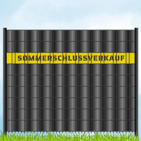 Der Schriftzug SOMMERSCHLUSSVERKAUF ist direkt aus dem Material herausgelasert, was eine wetterbeständige und langlebige Alternative zu herkömmlich bedruckten Sichtschutzstreifen darstellt. Mit verschiedenen Farben zur Auswahl kannst du deinem Zaun ein individuelles und attraktives Aussehen verleihen.