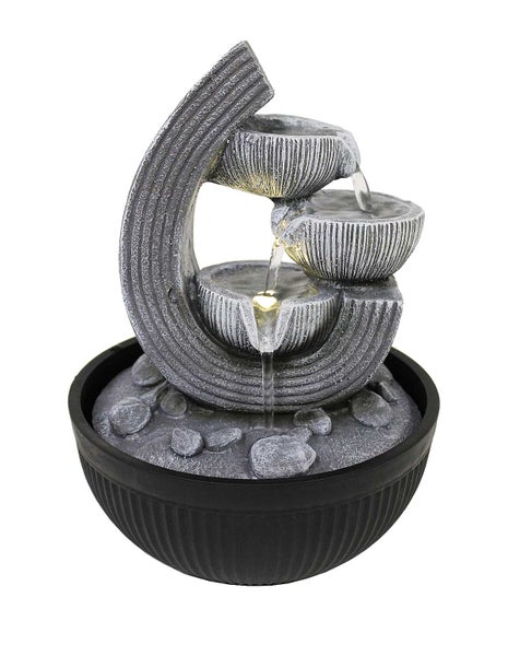 - Spannendes Wasser- / Lichtspiel. Das von Schale zu Schale plätschernde Wasser wird von einer warmweißen Led durchleuchtet.