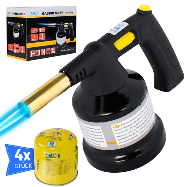 ZMC Gasbrenner 1,3 kW + 4 Gaskartuschen 190g, Schweißbrenner Flambierbrenner bis zu 1350°C, Bunsenbrenner Lötbrenner Brenneraufsatz, Küchenbrenner mit einstellbare Flamme, mit Piezo-Zündung