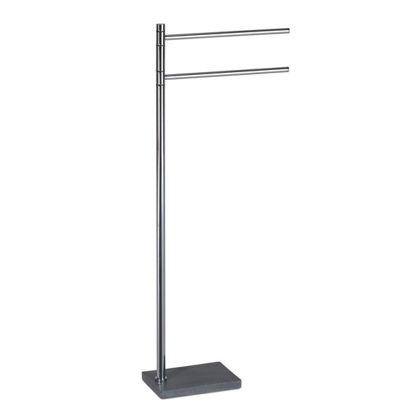 Zweiarmiger Handtuchhalter aus Edelstahl mit dunkelgrauem Harzsockel. Mit dem Handtuchständer können die Handtücher nach jedem Gebrauch ordentlich verstaut werden. So haben Sie ein Badezimmer mit allem, was Sie brauchen, ohne Löcher in die Wände bohren zu müssen. Der Handtuchständer muss montiert werden.