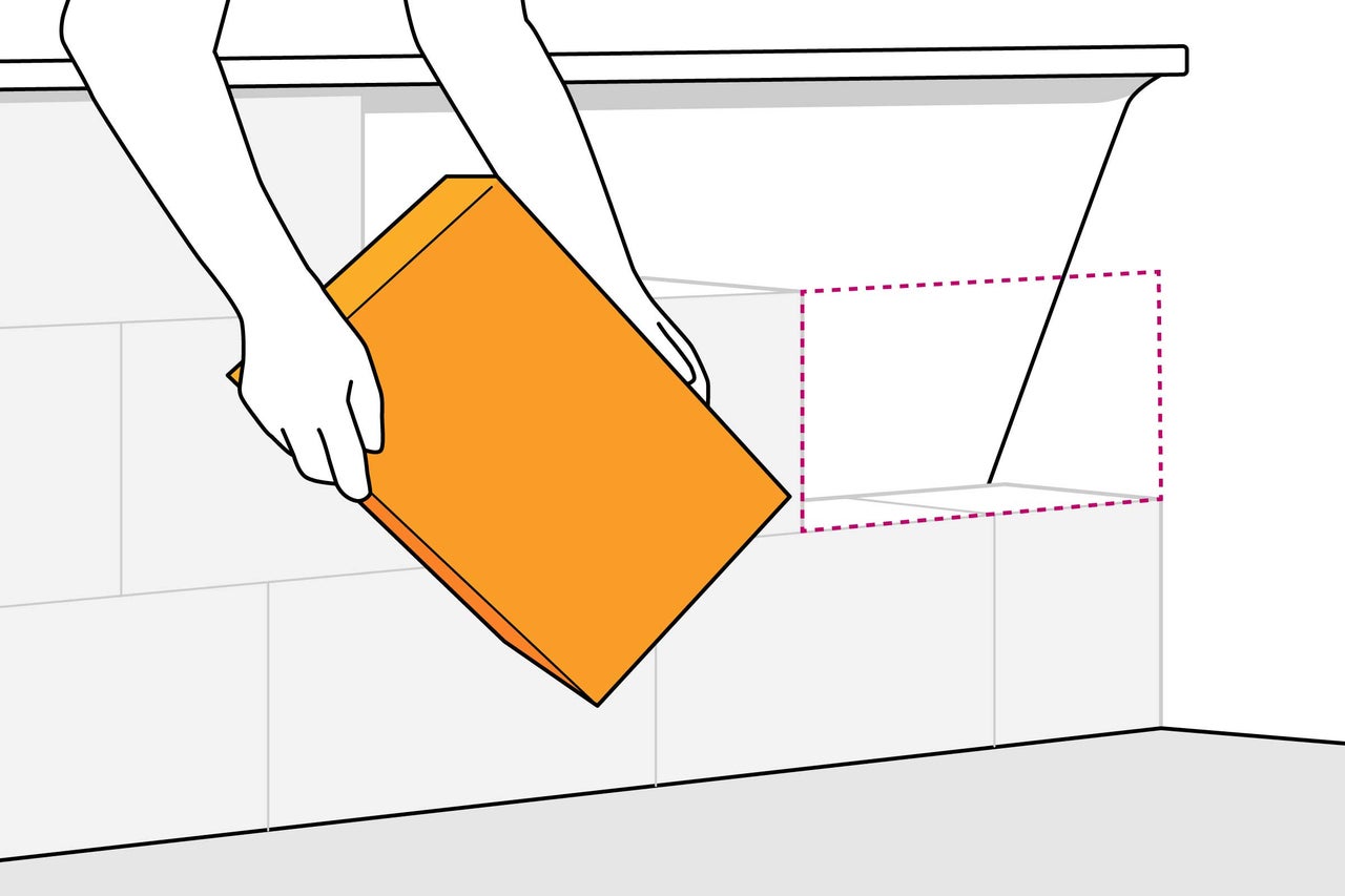 Damit Du weißt, wie viele Steine Du für Deine Verkleidung brauchst, musst Du alles gründlich ausmessen. Miss dafür die Wannenhöhe vom Boden bis zum Wannenrand sowie die Länge und Seitenteile. Die Steine sollten bündig mit dem Wannenrand abschließen. Zeichne auf den Boden die Umrisse Deiner Verkleidung vor.