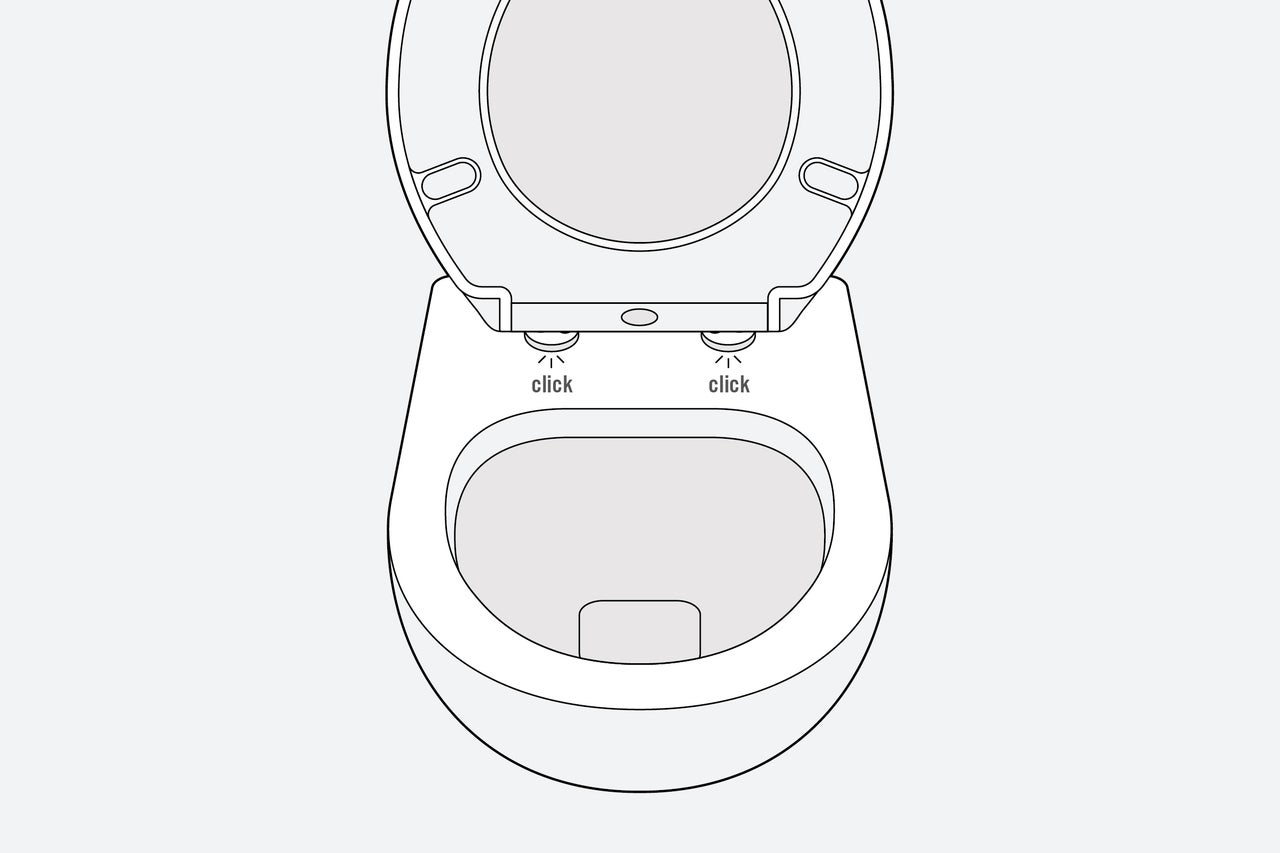 Eine Besonderheit sind WC-Sitze mit Quick-Relase System. Viele neue WC-Sitze lassen sich mit einem Klick entfernen – perfekt für die Reinigung. Der WC‑Sitz lässt sich mit einem Knopf, zwei Tasten oder einem Klicksystem abnehmen. Du findest auf der Oberseite oft einen kleinen Druckknopf zwischen oder hinter den Scharnieren. Wenn Du den Sitz leicht nach oben ziehst und er sich löst, ist es diese Methode.