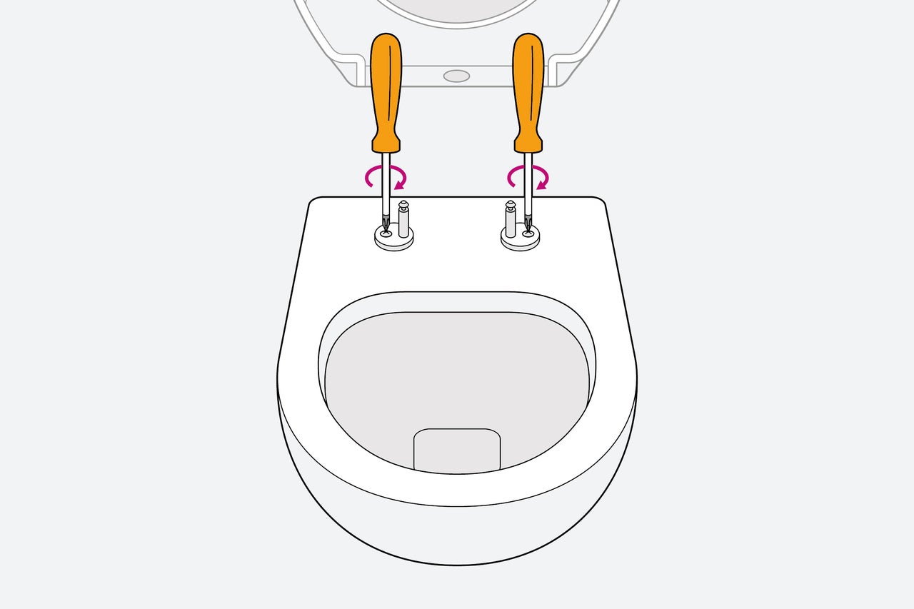 So funktioniert’s: Die Schrauben des WC-Sitzes gehen durch die Öffnungen der Keramik. Unter der Toilette schraubst Du Muttern, meist Flügel- oder Kunststoffmuttern, fest.